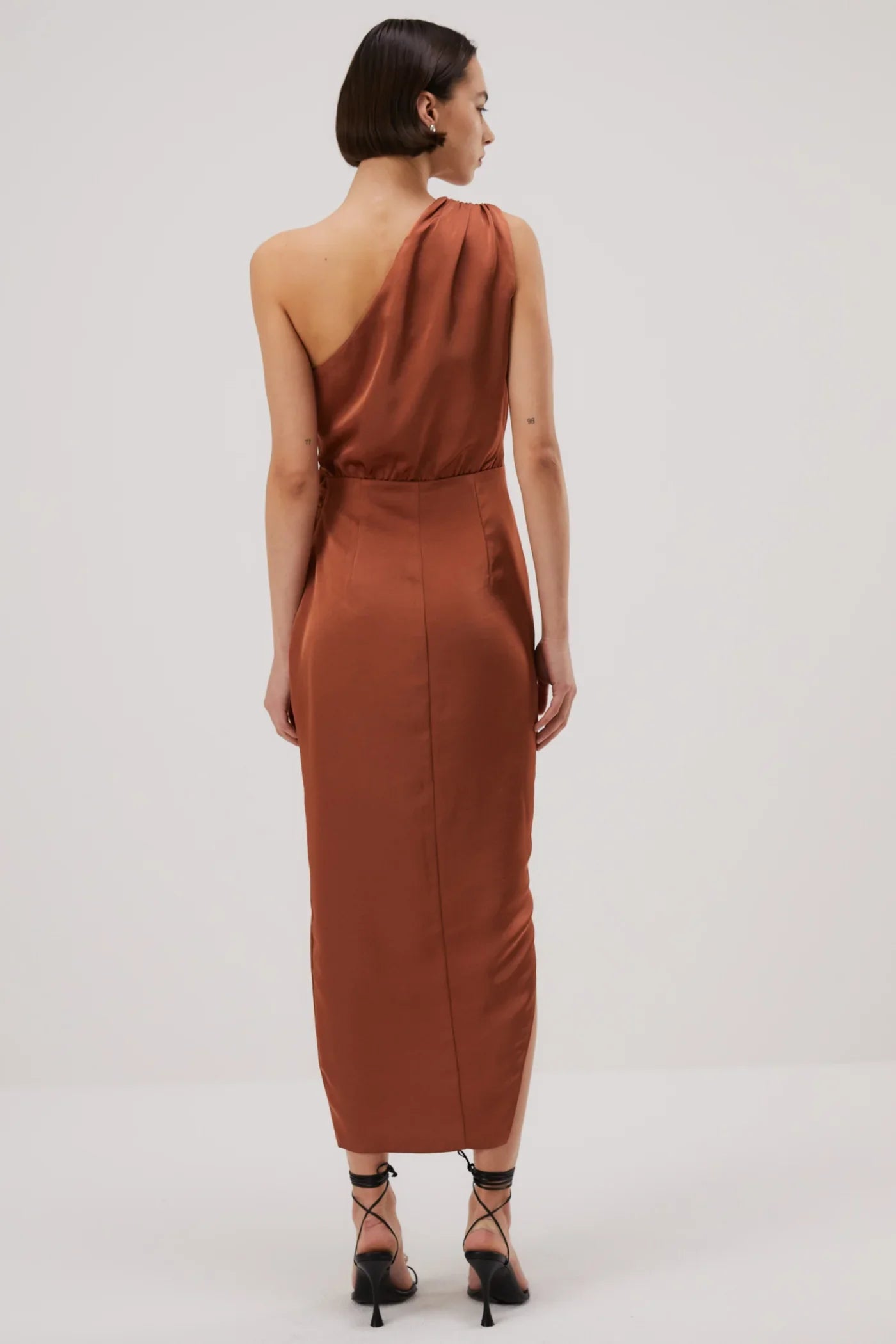Sisters By Heart Midi Dress Asymmetric Cowl Neck Dress In Copper Satin Showpo